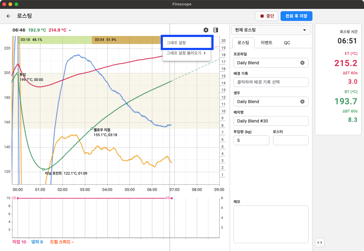로스팅 페이지에서 그래프 기준 오른쪽 상단의 **설정 아이콘** 버튼을 클릭하고 **그래프 설정**을 선택합니다.