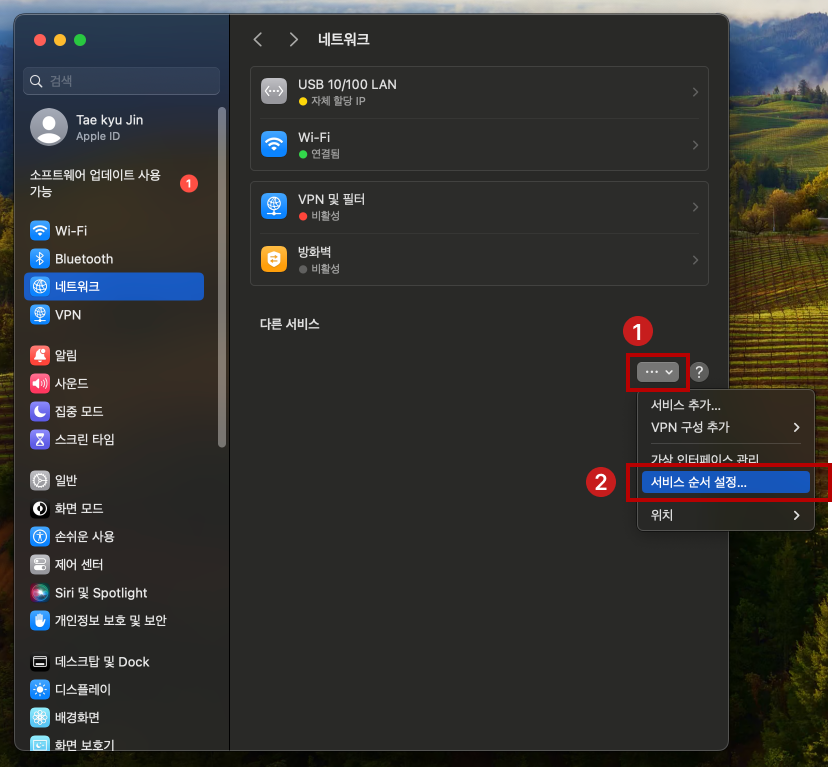 네트워크 탭에서 우측 하단의 **서비스 순서 설정** 버튼을 누릅니다.&#x20;