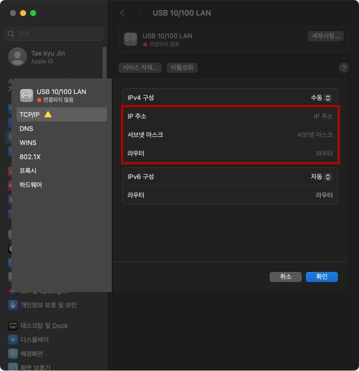 세부사항 편집창에서 왼쪽 탭 중 **TCP/IP**를 클릭하고 IPv4 구성을 **수동**으로 바꿔줍니다.