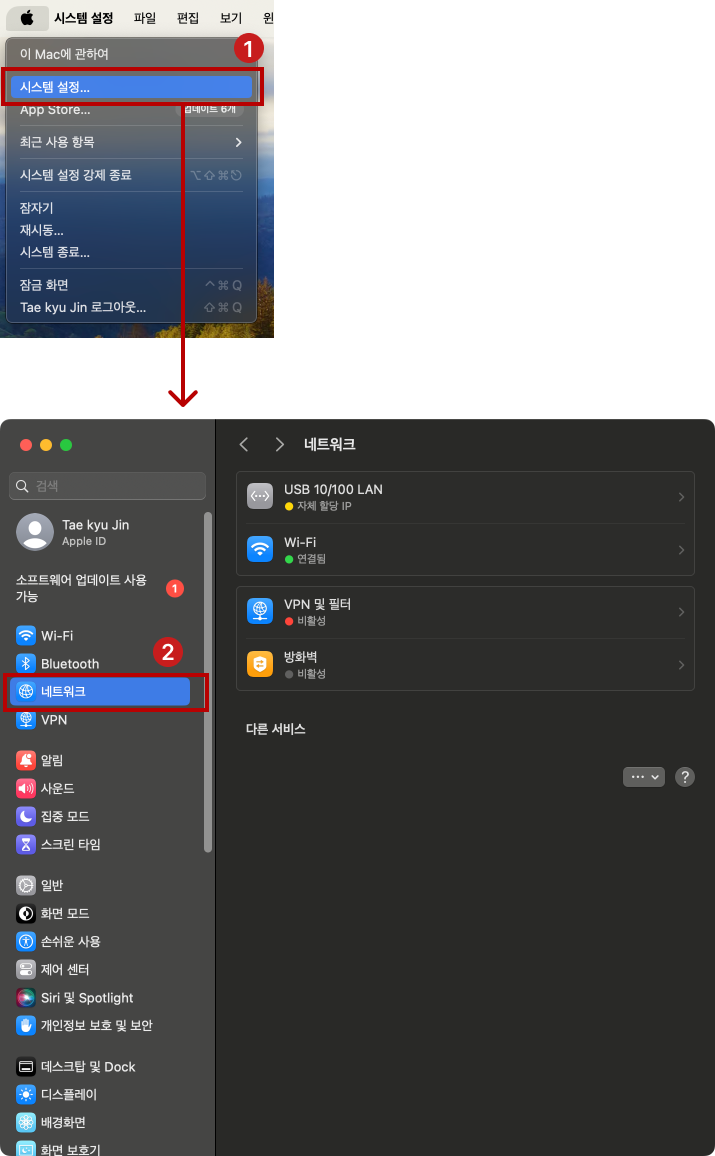 좌상단의 애플 아이콘 클릭 후 **시스템 설정**을 클릭합니다. 설정 창에서 왼쪽의 탭 중 **네트워크 탭**에 들어갑니다.